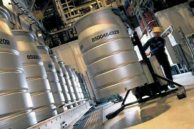 Radioactive waste is categorized and managed in terms of its radioactive content and thermal characteristics. Wastes categorized as "high-level" -- including spent nuclear fuel and byproducts of fuel reprocessing activities -- must be immobilized and transported for isolation in engineered vaults or underground repositories. The wastes pose long-term hazards to people and the environment. Scientific approaches for solidifying and immobilizing high-level wastes include vitrification in borosilicate glass. (Photo Credit: World Nuclear Transport Institute)