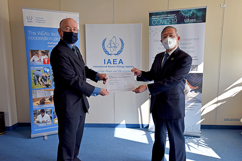 Eighty-three countries pledged their contribution to the IAEA Technical Cooperation Fund for 2021. Here, Ambassador and UK Resident Representative to IAEA, Dr David Hall, hands the UK pledge to Deputy Director General Yang.