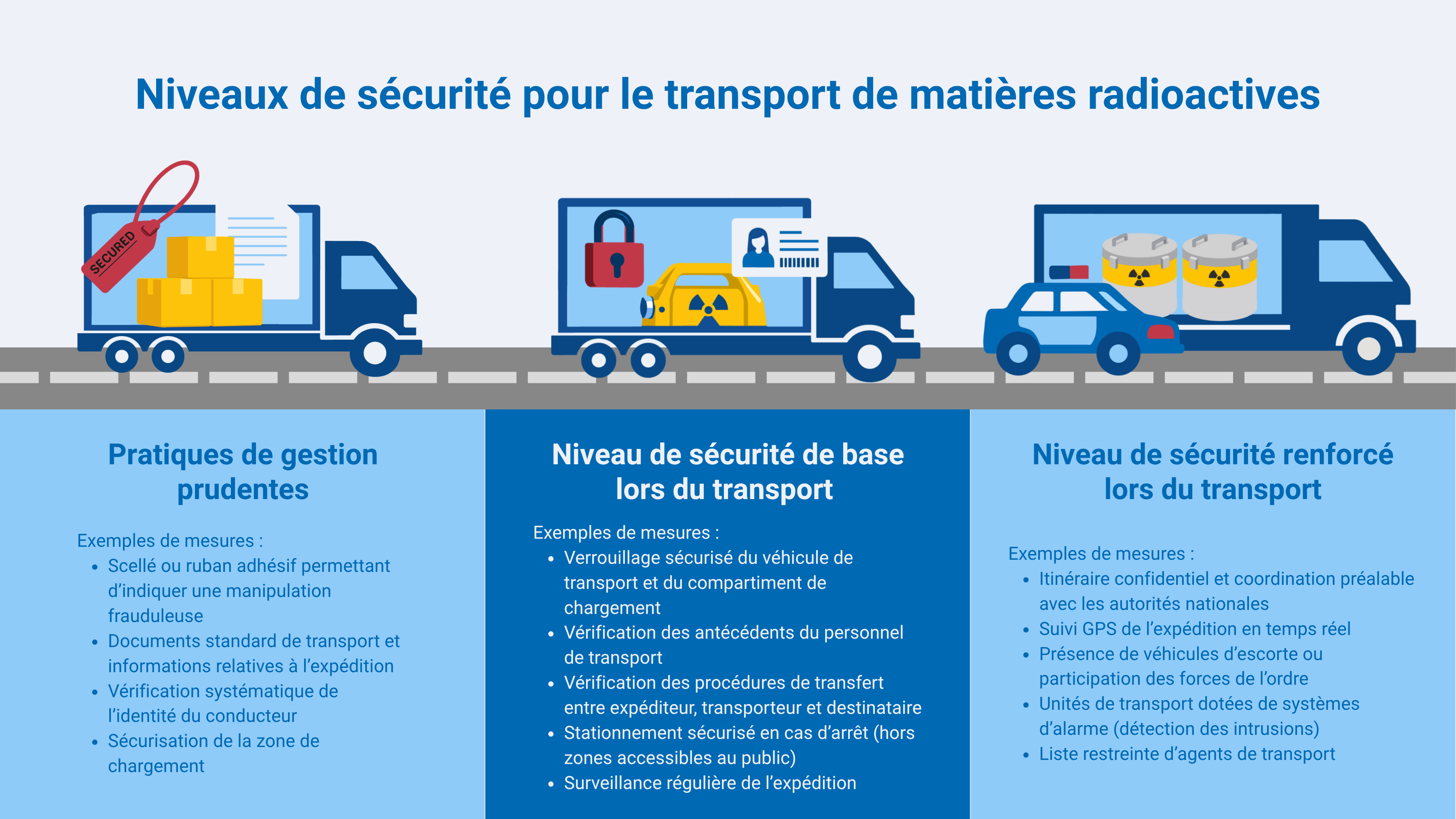 Les dispositions relatives à la sécurité du transport suivent également une approche graduée : elles sont fondées sur le niveau de risque et tiennent compte de la quantité et des propriétés physiques et chimiques des matières radioactives, de leur emballage et du mode de transport. Les mesures de sécurité visent à détecter rapidement les menaces potentielles, à empêcher les actes malveillants en créant des obstacles et à préparer les agents de sécurité à intervenir efficacement pour neutraliser la menace et atténuer les dommages.