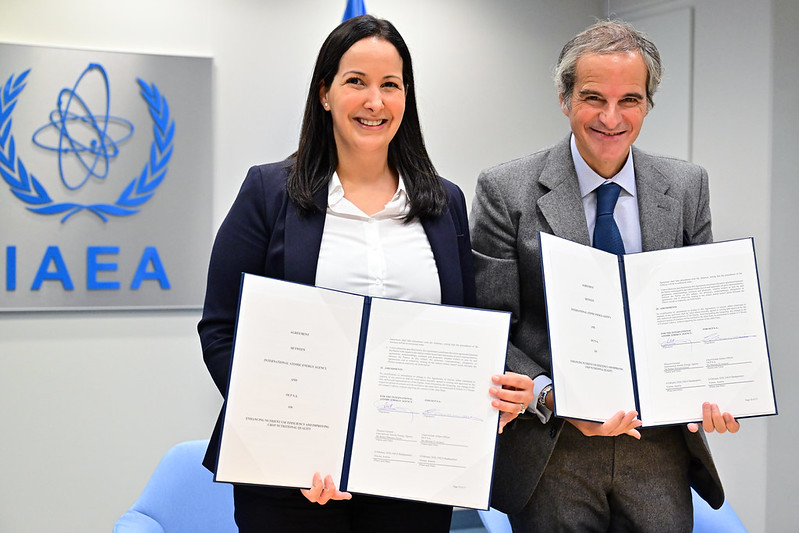 La directrice des affaires mondiales du Groupe OCP, Meriem El Asraoui, et le Directeur général de l’AIEA, Rafael Mariano Grossi, ont signé un accord visant à améliorer l’efficience de l’utilisation des nutriments et à accro?tre la qualité nutritionnelle des cultures, au Siège de l’AIEA à Vienne (Autriche). (Photo : D. Calma/AIEA)