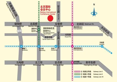 The convention center is located in the Olympic Green area, adjacent to the National Stadium (“Bird's Nest”) and National Aquatics Center (“Water Cube”). The closest metro station is Olympic Green Station (Lines 8 & 15).