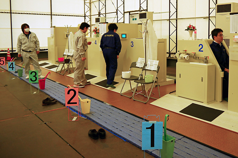 Workers entering and leaving the Emergency Response Centre. Masks are worn outside the centre to prevent the inhalation of radioactive particles. Protective clothing includes a double layer of rubber gloves, and disposable overalls made of an extremely strong, lightweight fabric.
