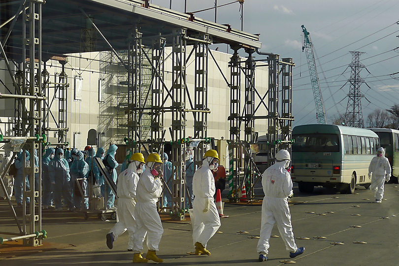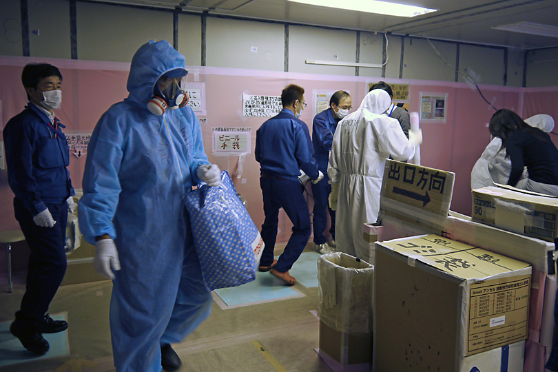 Workers in protective clothing and masks outside the Emergency Response Centre, the main control hub at the Fukushima Daiichi site. The building, which is heavily shielded from on-site radiation, was completed just a few months before the accident to act as a seismically stable control centre in case of earthquake.