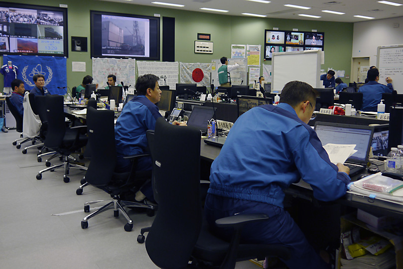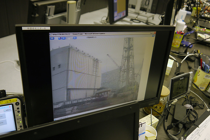 Workers monitor the plant from the Emergency Response Centre. A live CCTV image of Units 1 and 2 appears on the screen behind. Due to high on-site radiation, many instruments have to be monitored remotely via CCTV.
