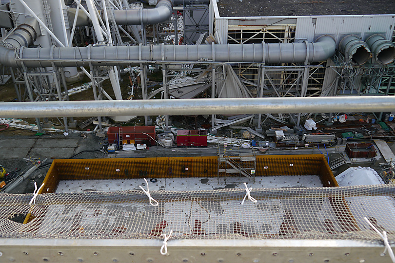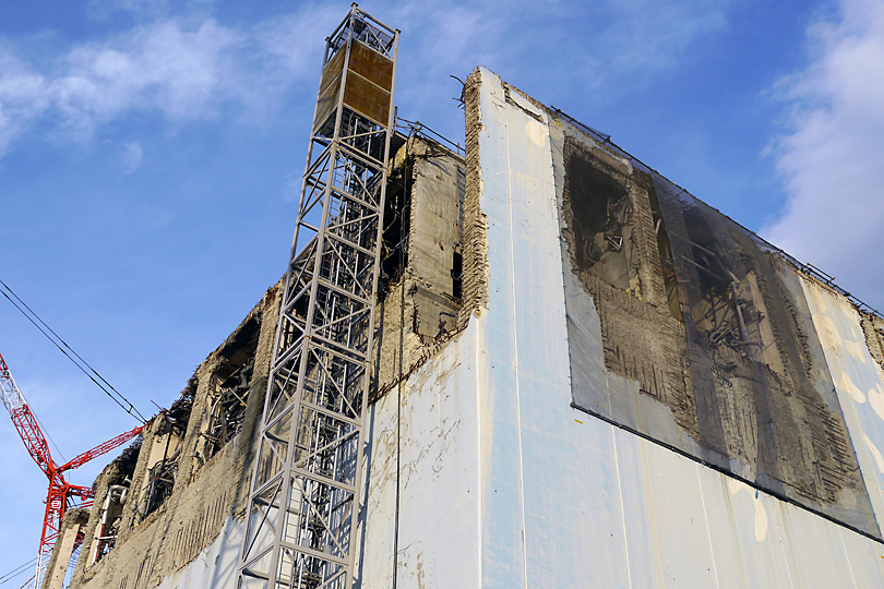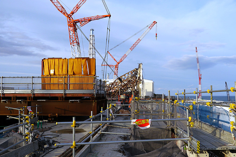 Unit 4 of Fukushima Daiichi Nuclear Power Plant. The remains of the building's upper levels, which were destroyed by a hydrogen explosion, have been removed to allow for construction of a cover, so that fuel stored in the Unit's spent fuel pool can be moved to a common pool.