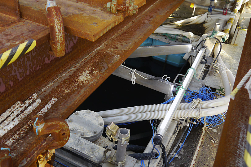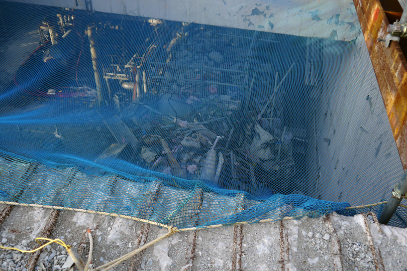 The surface of the spent fuel pool at Unit 4. At the time of the accident, Unit 4's reactor was under maintenance and the fuel had been transferred to the pool, where it remains under plastic floats and a temporary metal roof until it can safely be removed. Steel pillars and a concrete wall have been installed as reinforcement underneath the pool, but moving the fuel out of the damaged building is seen as a priority.