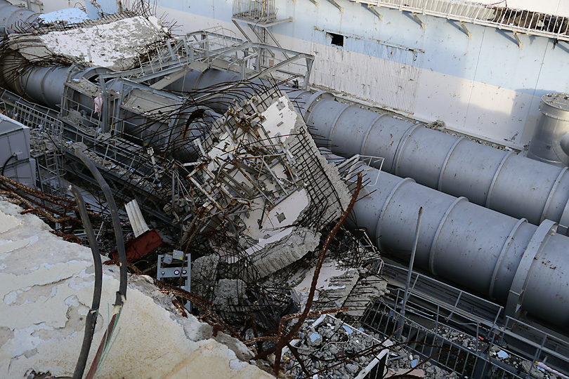 Rubble from the hydrogen explosion lies inside the damaged Unit 4 building. The wall to the right is the side of the spent fuel pool.