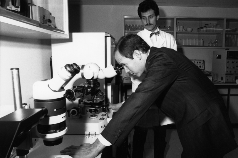 Here, Prince Albert II of Monaco looks at sediment samples under a microscope during his visit to the International Laboratory of Marine Radioactivity.