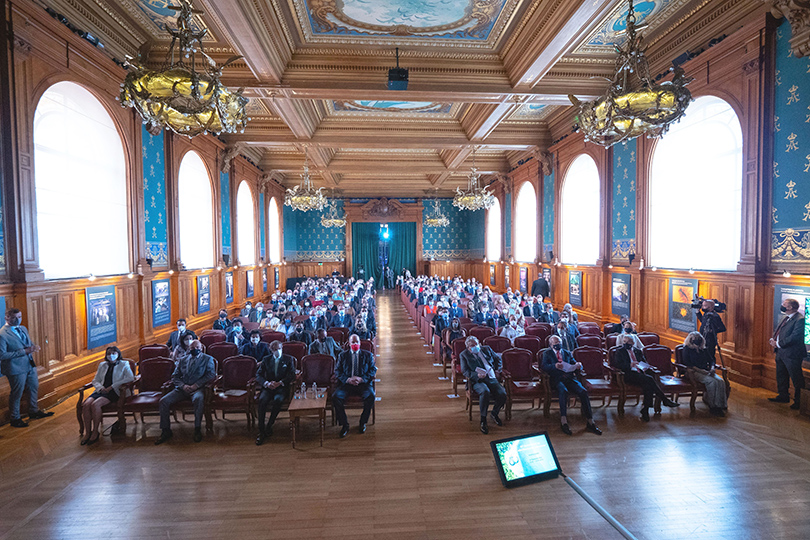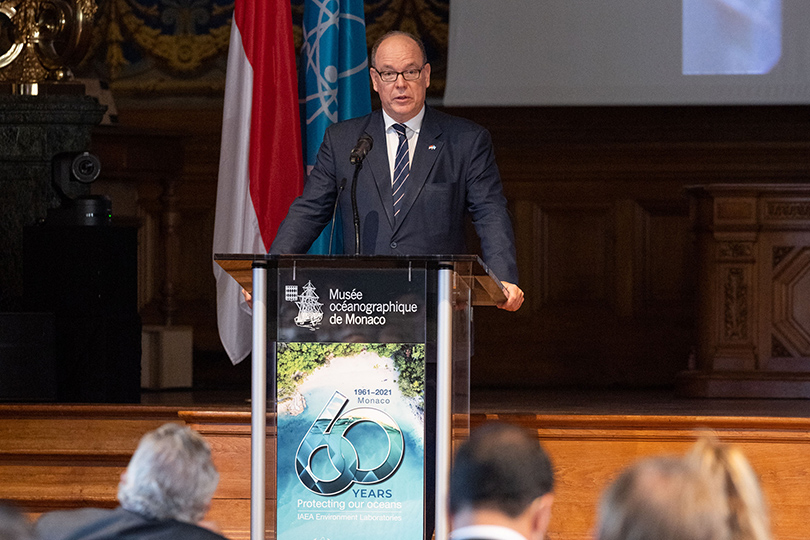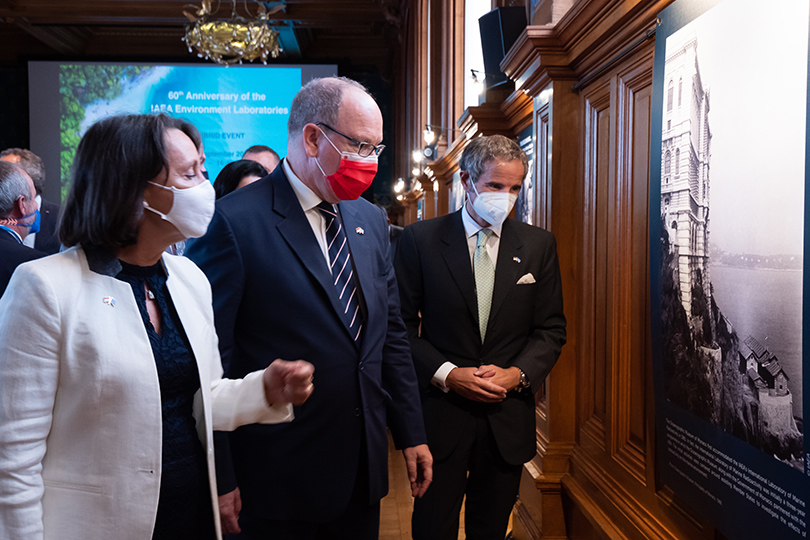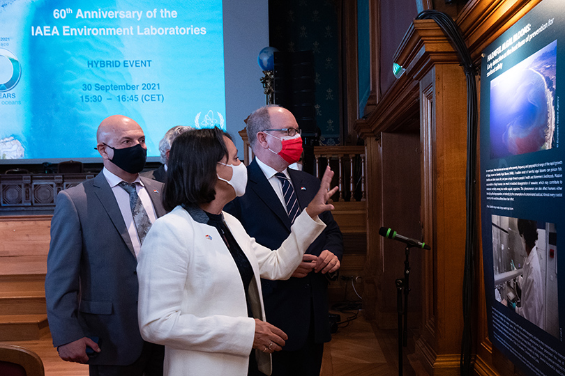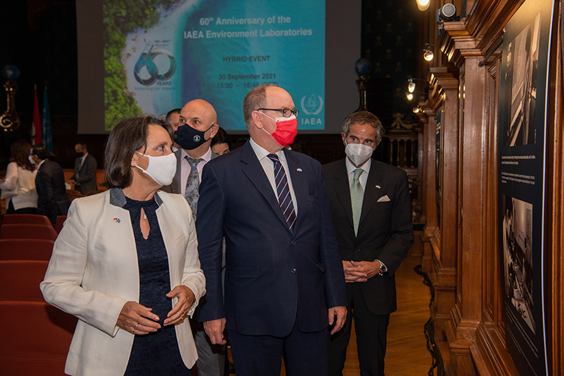 Celebration of 60 years of the IAEA Environment Laboratories in Monaco, in the presence of H.S.H. Prince Albert II of Monaco, IAEA Director General Rafael Mariano Grossi, Director of the Oceanographic Museum of Monaco Robert Calcagno, IAEA Deputy Director General and Head of the Department of Nuclear Sciences and Applications Najat Mokhtar, Director of the IAEA Environment Laboratories Florence Descroix-Comanducci, accompanied by Ambassadors of Vienna-based Permanent Missions and IAEA staff, Oceanographic Museum of Monaco, 30 September 2021.
