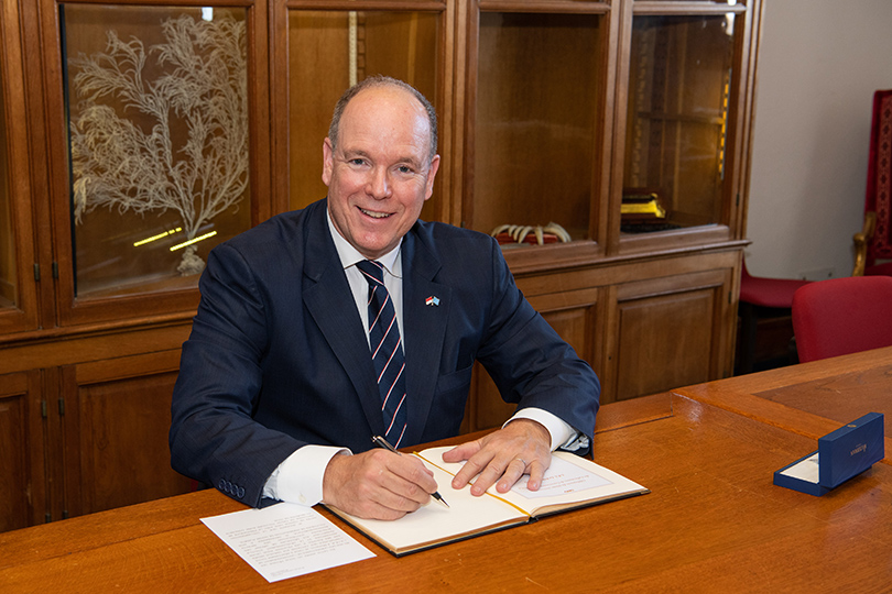 H.S.H. Prince Albert II writes a message on the occasion of the 60th anniversary of the IAEA Environment Laboratories in Monaco in the guestbook of the Oceanographic Museum - the first home of the Agency's International Laboratory of Marine Radioactivity, 30 September 2021.