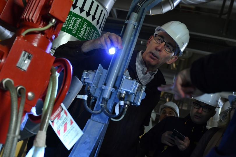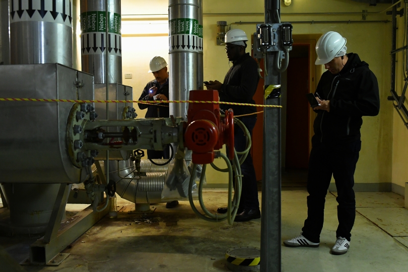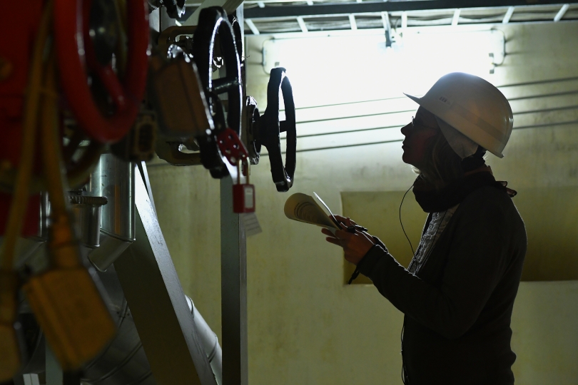 A participant examines a valve in the Zwentendorf Nuclear Power Plant’s condenser bay during a training exercise.