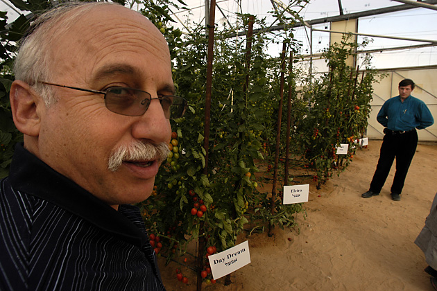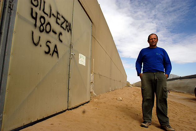 For Israeli farmer Ezra Ravins, success means he can sell his bell peppers to lucrative export markets like the USA where imported fruit and vegetables must come from fruit-fly-free zones. Mr. Ravins stands next to one of his greenhouses.