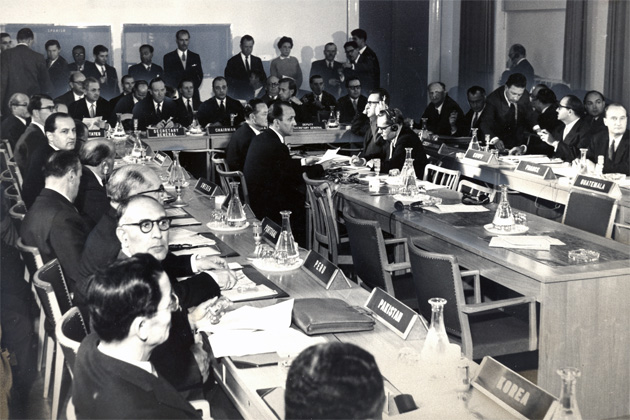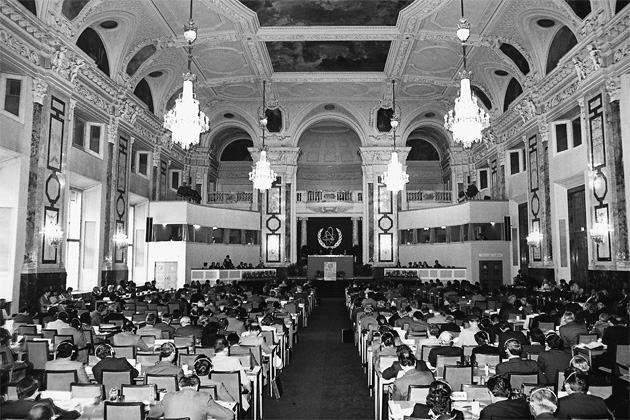 IAEA's First General Conference at the Konzerthaus. Here scientists and diplomats from 55 nations met to bring the new atomic agency into operation. The focus of the IAEA was the use of atomic energy for peace, health and prosperity throughout the world. 1 to 23 October 1957. (Photo Credit: IAEA)