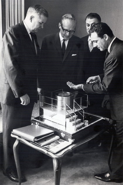 Commissioner Gerald Tape of the US Atomic Energy Commission donates a model to the IAEA of a sub-critical assembly unit showing technical information on its design and fabrication. September 1964 (Photo Credit: IAEA)
