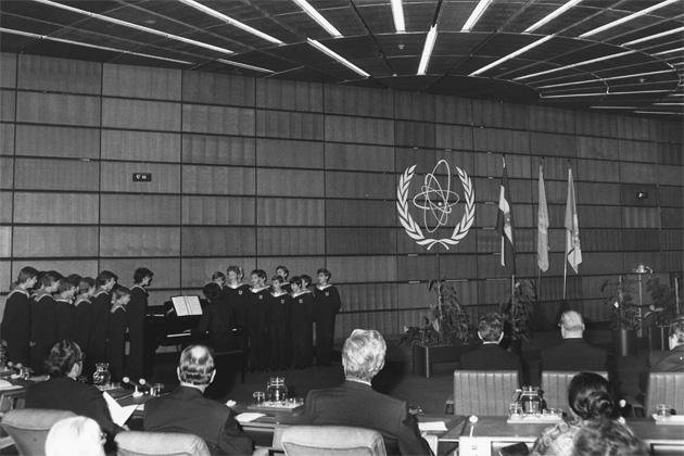 A guest performance of the Vienna Choir Boys at the IAEA Board of Governors meeting during the 1980s. (Photo Credit: IAEA)