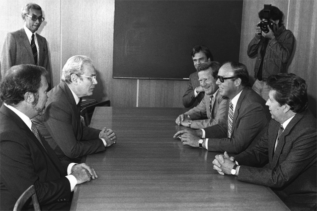 United Nations Secretary-General Javier Perez de Cuellar visits IAEA Director General Hans Blix. (Photo Credit: IAEA)