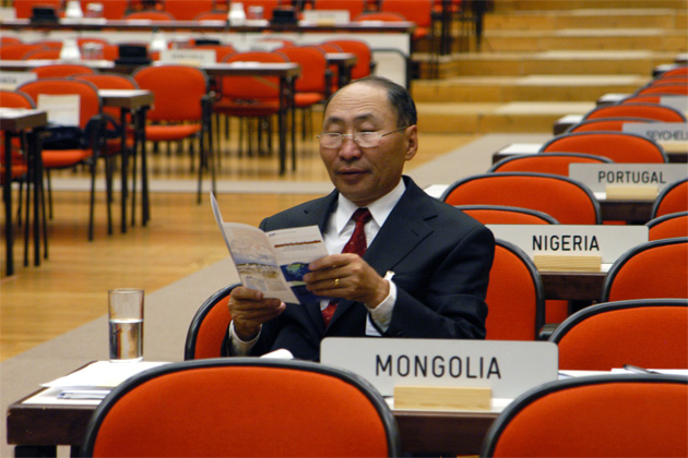 A delegate of Mongolia waits patiently before the opening of the IAEA 47th General Conference at the Austria Center. Vienna, Austria, 15 September 2003 (Photo Credit: Dean Calma)