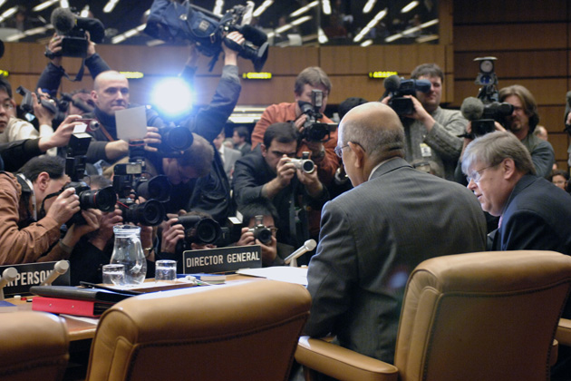 Under the media glare, IAEA Director General Mohamed ElBaradei briefs the International Press. IAEA Board room, Vienna, Austria, 2 February 2006 (Photo Credit: Dean Calma)