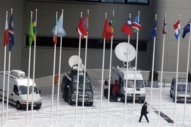 Satellite and cable television crews covering the March 2006 IAEA Board meeting set up on the grounds of the Vienna International Centre. Vienna, 8 March 2006 (Photo Credit: Dean Calma)