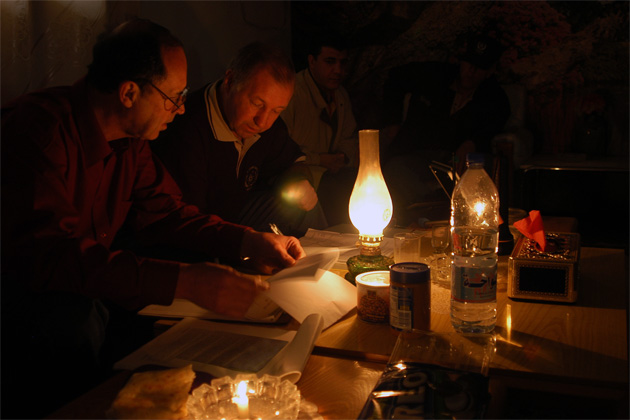 IAEA inspectors go over plans during an overnight stay near Al Qaim where they worked by candlelight due to a power cut. Iraq, December 2002 (Photo Credit: Petr Pavlicek)