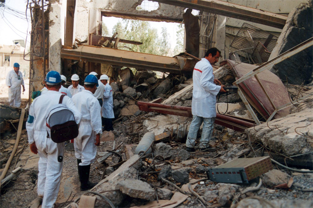 Inspectors assess the ruins of a facility used to produce highly enriched uranium during the IAEA inspections in Iraq. Action Team 1991-1998 (Photo Credit: Petr Pavlicek)