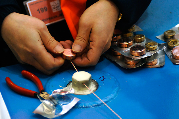 23:00 hours: IAEA's Cobra seals can be verified on site. The wire and the seal are photographed at the moment when they are applied. A special camera tells inspector Jeong in an instant whether the seal has been tampered with or not.