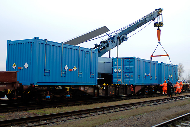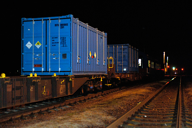 16:00 hours: Mesice train station near Prague. The shipping containers are loaded on the train.
