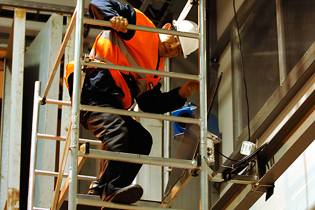 22:00 hours: IAEA Safeguards Inspector Jeong Eui Sang starts his manual work by climbing the scaffolding to reach an IAEA surveillance camera. He downloads images from the camera that monitored the hall until today, 7 days a week, 24 hours a day.