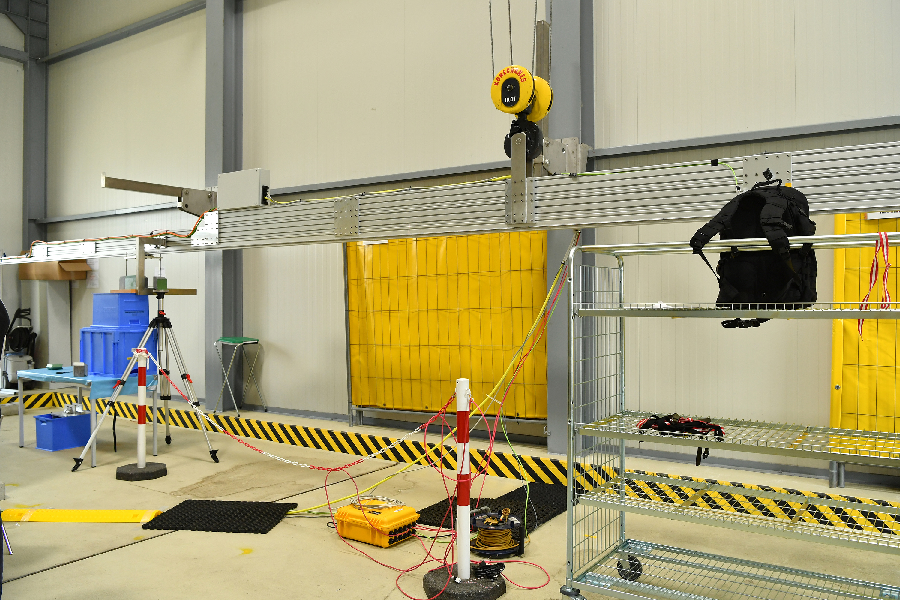 The dynamic alarm response test replicates the scenario when a BRD, a radiation source, or both are moving, to assess the BRD’s sensitivity and time required to produce an alarm. Testing the sensitivity of the BRD under dynamic situations requires setting up the BRD at exact distances from a track, like shown in the previous photo. A radiation source is mounted on a remotely controlled sled on the track and then travels along the track at controlled speeds. Numerous measurements at each distance/speed combination are made to determine the sensitivity of the BRD.