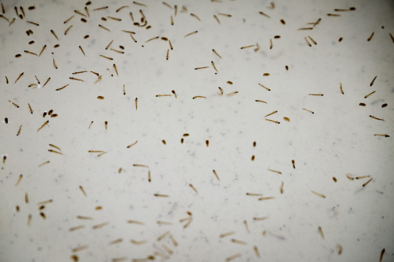 As part of the mass-rearing system, the FAO/IAEA scientists have developed trays where the mosquito eggs can be placed into water, which is part of their natural habitat. Here they develop into larvae and feed on the special meal that has also been developed at the laboratory and consists of tuna meal and bovine liver powder.