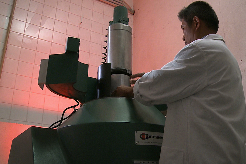 Pig's blood, collected from local abattoirs, is used to feed the female insects. It is heated first to body temperature. Around two litres of blood are used each day.