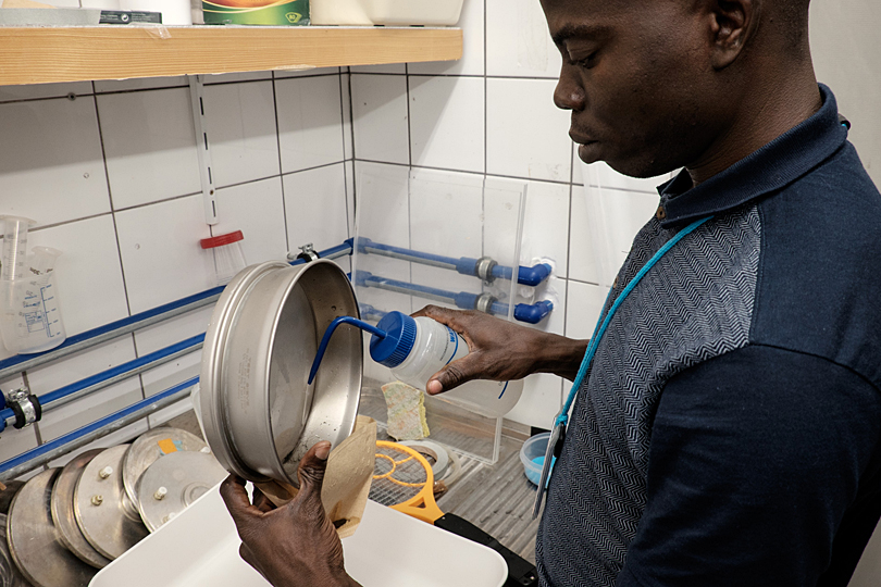 Eggs are collected from the holding cages on a daily basis and poured into filter paper. For the SIT to work, millions of sterile insects need to be released over a target area, so mass rearing of pests is the first step in any SIT programme.
