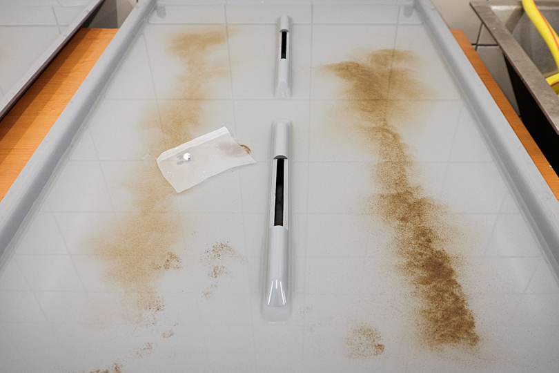 The pupae need to be collected to prepare them for irradiation. Currently the pupae and larvae are separated by hand, but the entomologists are developing methods for the automatic separation of pupae and larvae, which is less time-consuming.