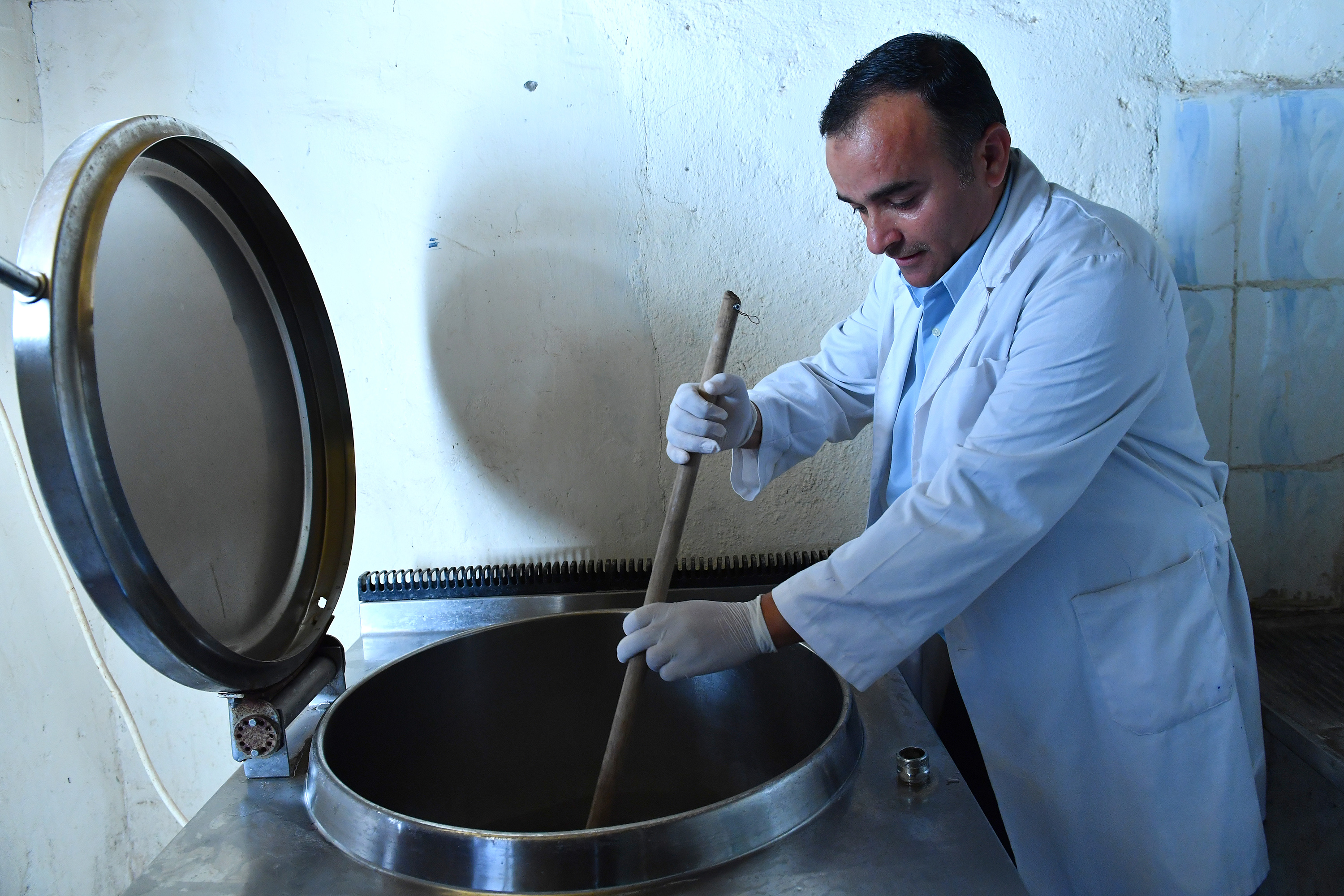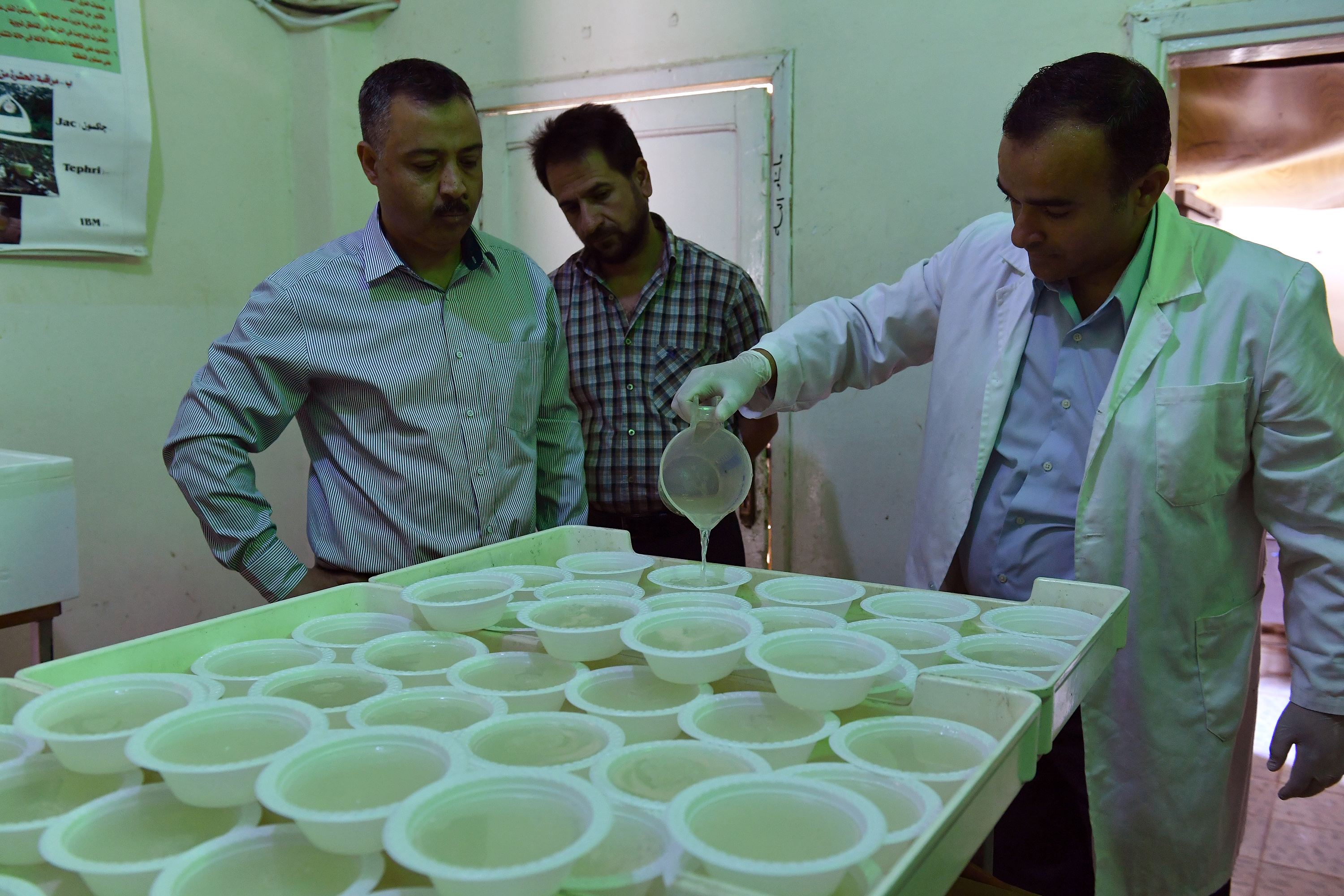 At the same time, Ahmad Abu Siam prepares the liquid food mixture of agar, water and sugar for the adult sterile flies to feed on.
