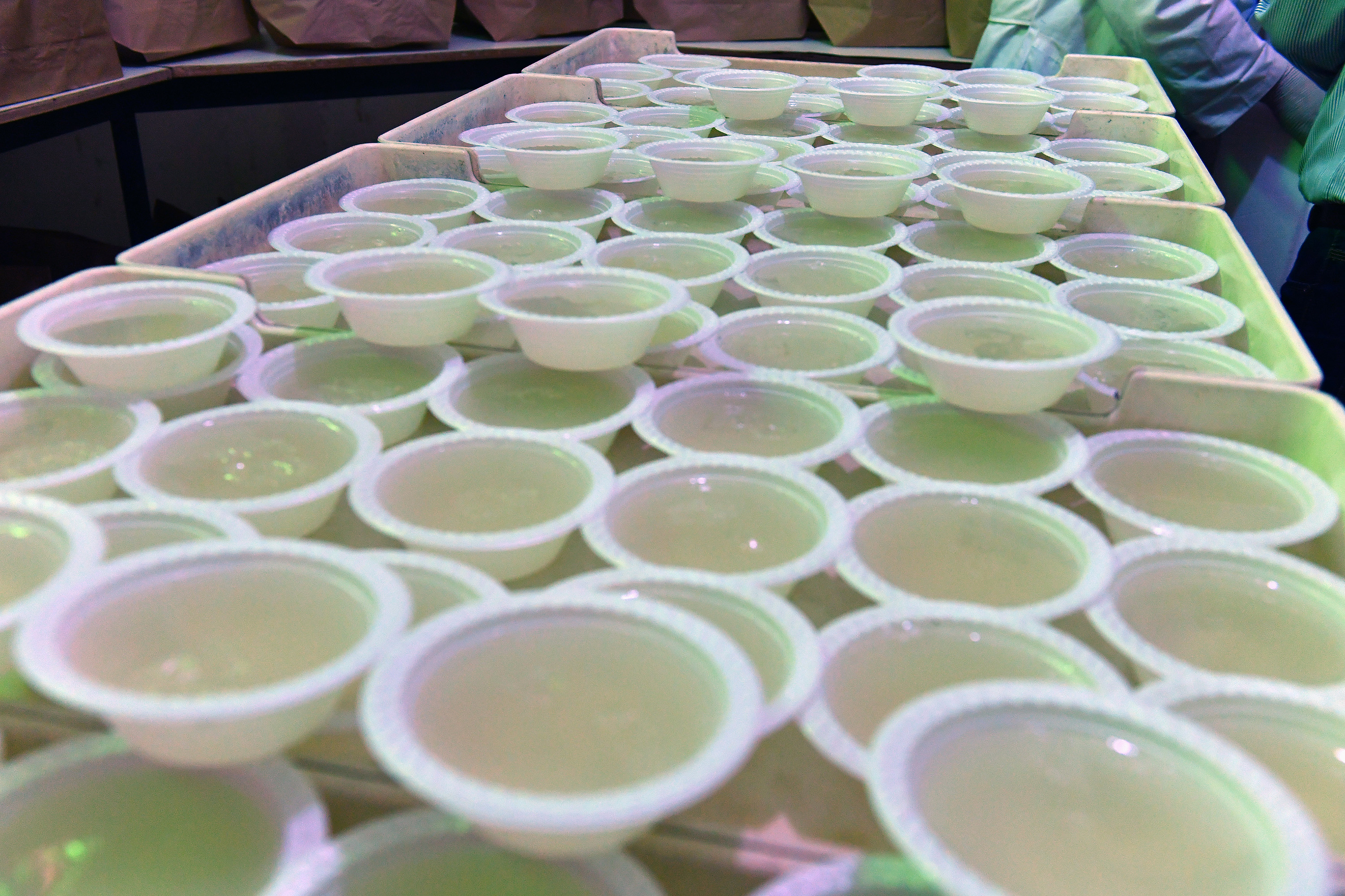 The prepared liquid agar food mixture for the adult sterile flies is carefully poured in plastic bowls or fiberglass trays to solidify.