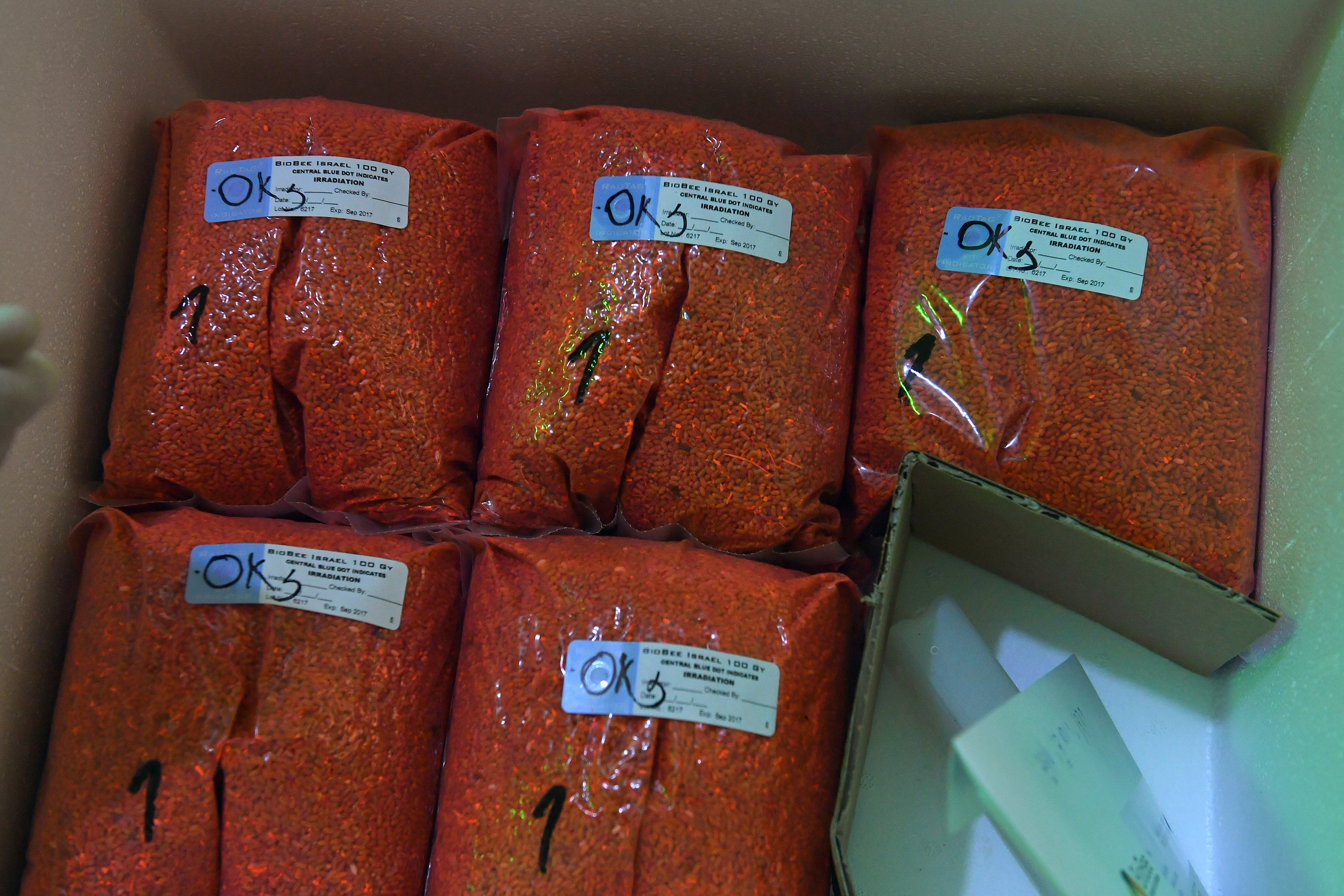 The irradiated pupae are sealed in plastic bags; each box contains about 750,000 male pupae.
