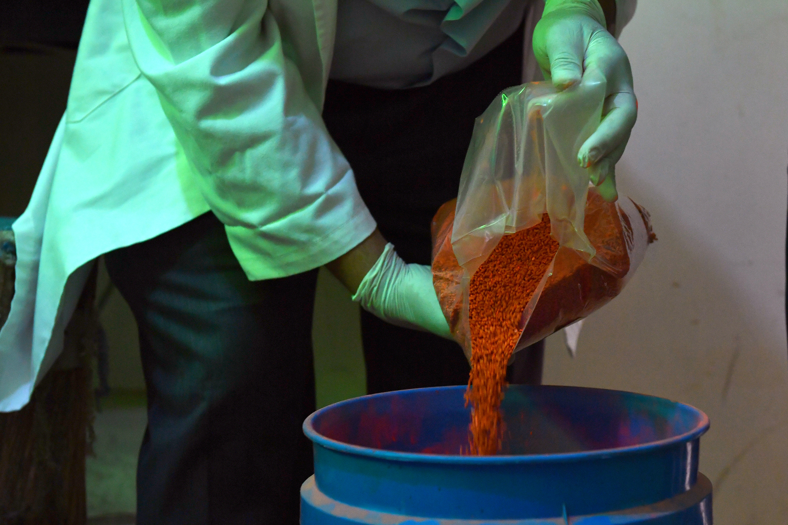 The pupae bag is opened and poured into a collection container, from which small samples are collected for quality control tests.