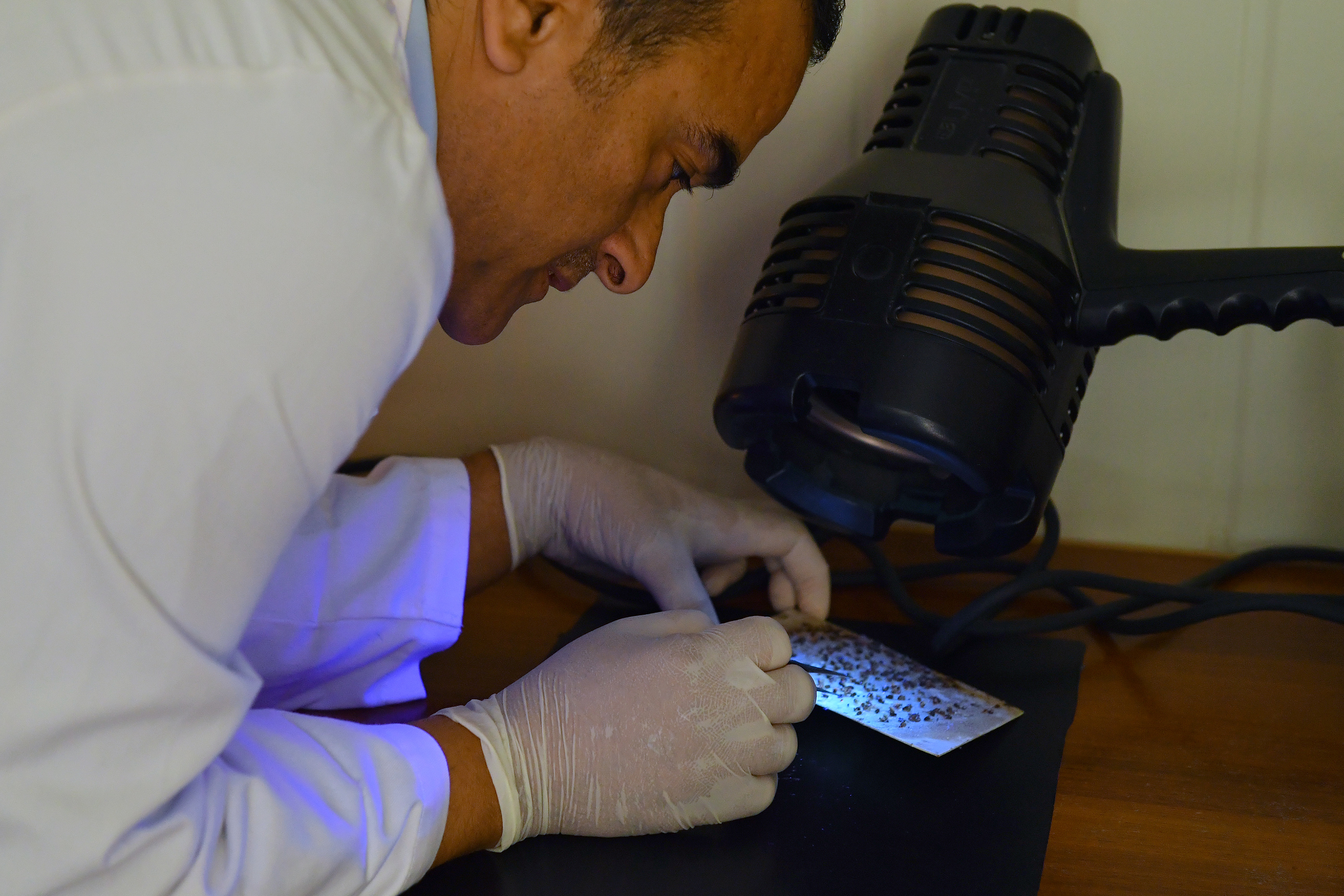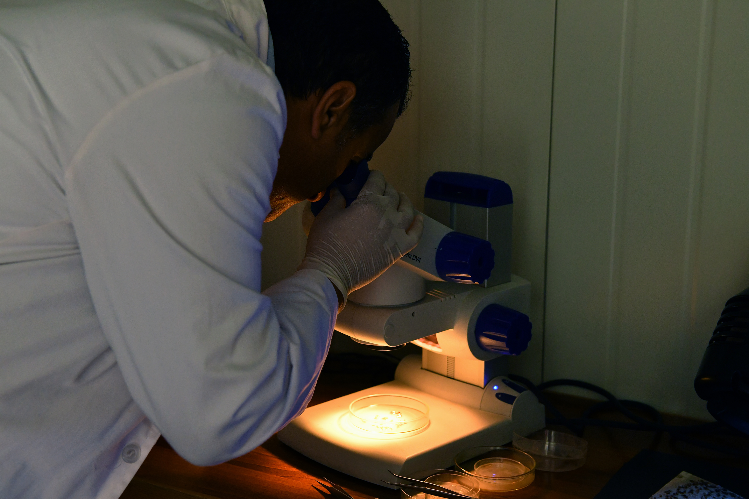 Ahmad Abu Siam examines the pupae samples with ‘quality control’ lab equipment provided by the IAEA.