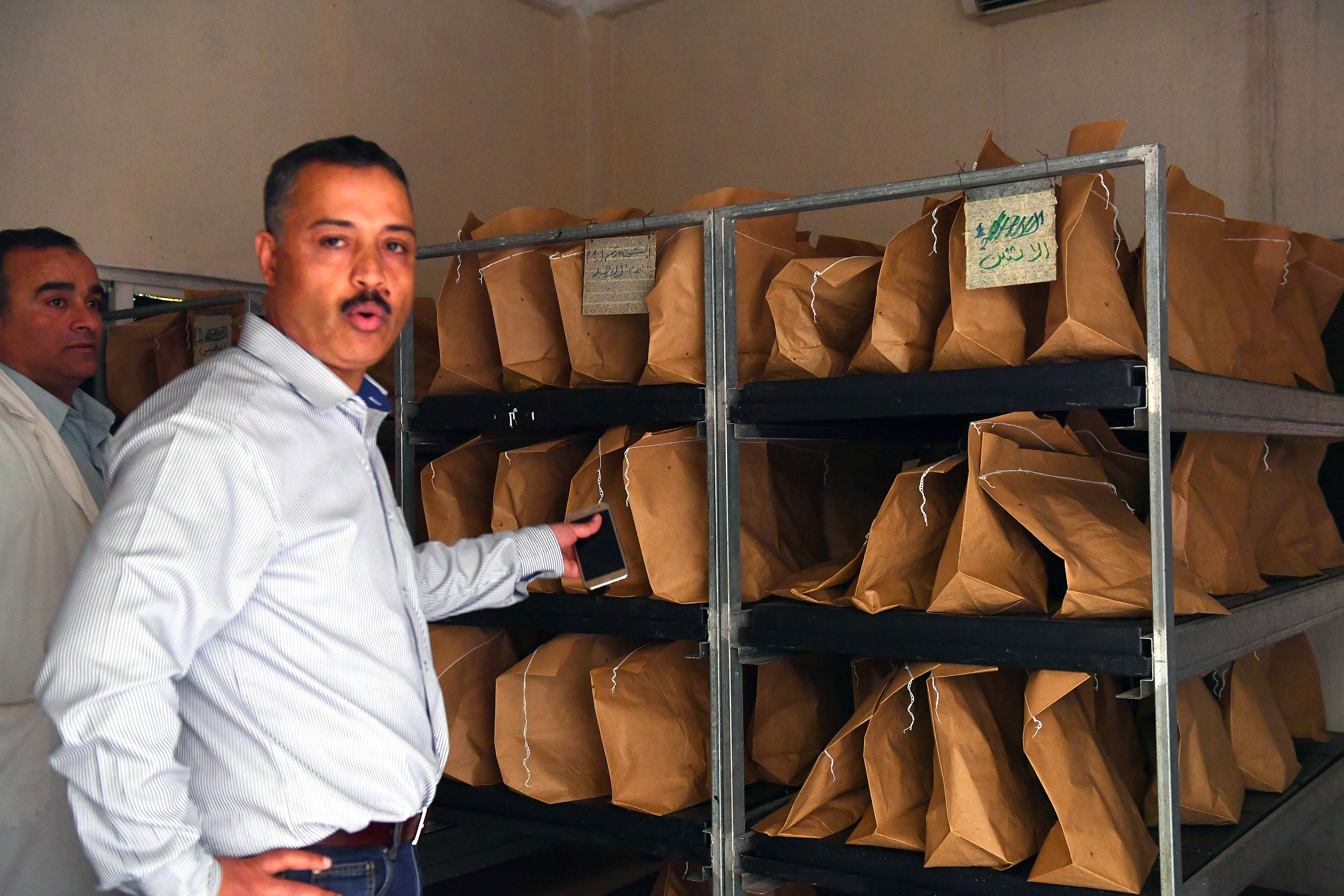 Ahmad Abu Siam along with Setan Al- serhan check the incubation room — a dark room with controlled temperature — where the pupae bags are stored until the flies emerge.