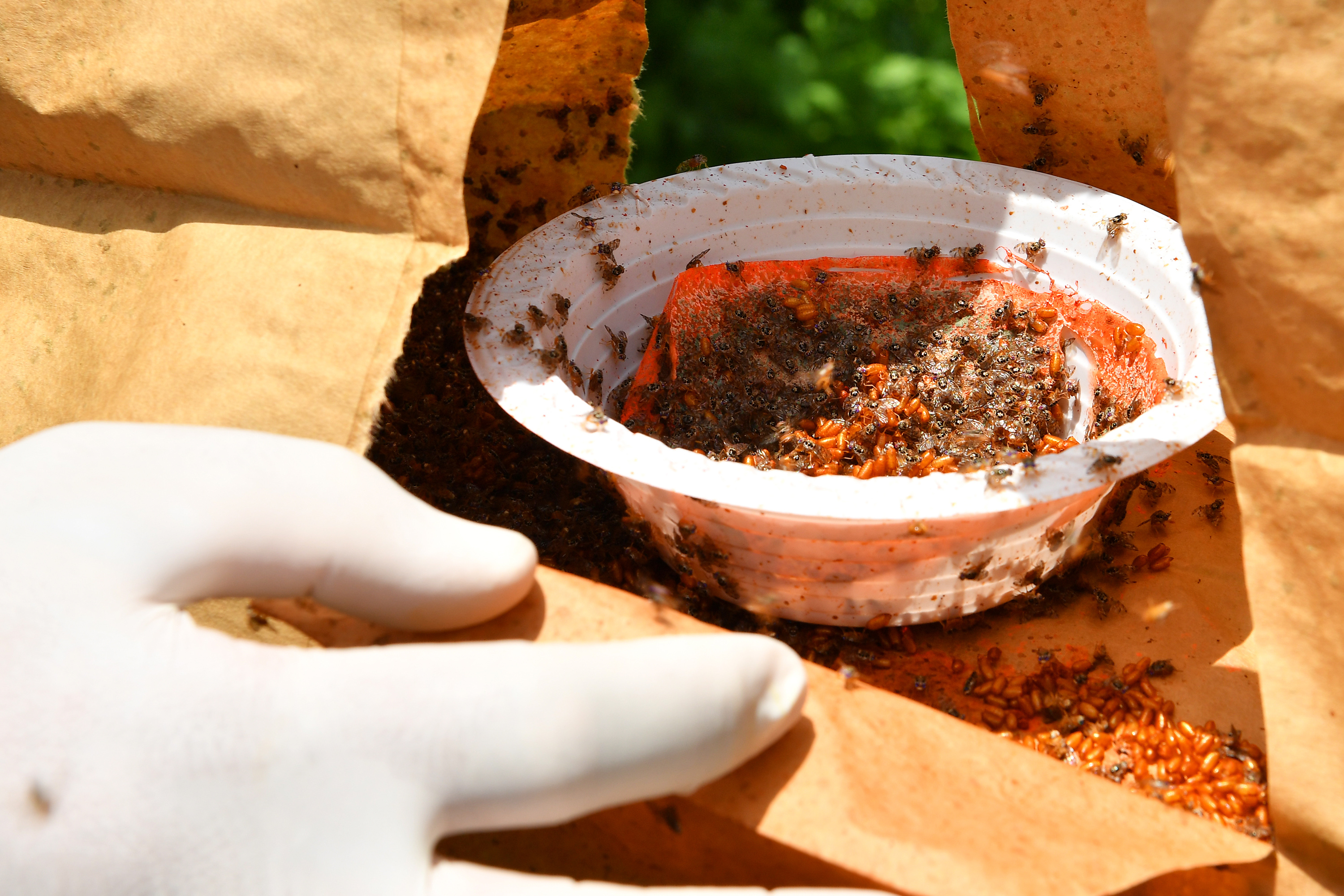 Careful attention is paid when the sterilized pupae are placed in bags that will be stored in the incubation room for six days.
