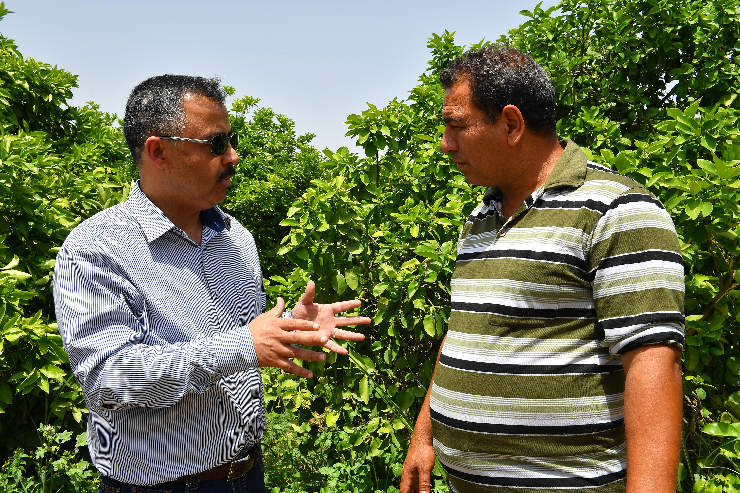 Farmer Moufaq Bashtawi in discussion with Setan Al-serhan on how his fruit production has benefited from the SIT control method.