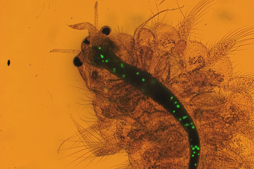 Due to their small size, some plastic fragments can be mistaken for plankton and may be inadvertently consumed by marine animals, such as mussels, shrimp and fish. This photo depicts a brine shrimp, also known as <em>Artemia</em>, after having consumed microplastic particles (in green).