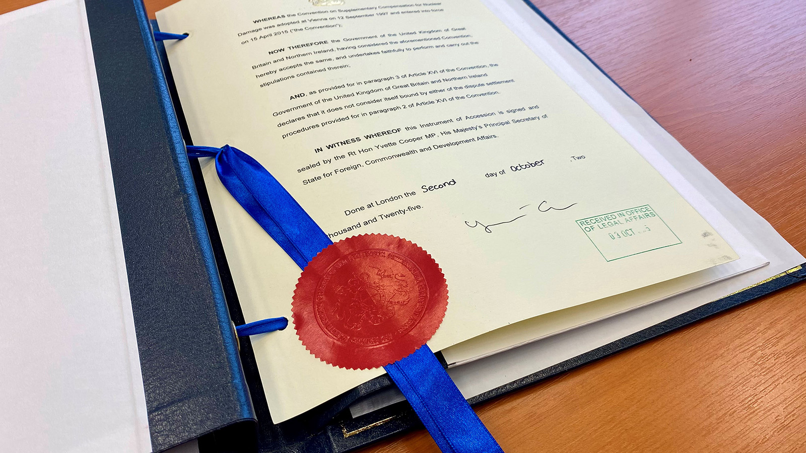 The United Kingdom deposited its instrument of accession to the Convention on Supplementary Compensation for Nuclear Damage (CSC) on 3 October 2025, strengthening the global nuclear liability regime and enhancing the capacity of nuclear power to support climate change mitigation, economic development and energy security. The CSC will enter into force for the UK on 1 January 2026, by which time the UK will become the 12th Contracting Party to the Convention.