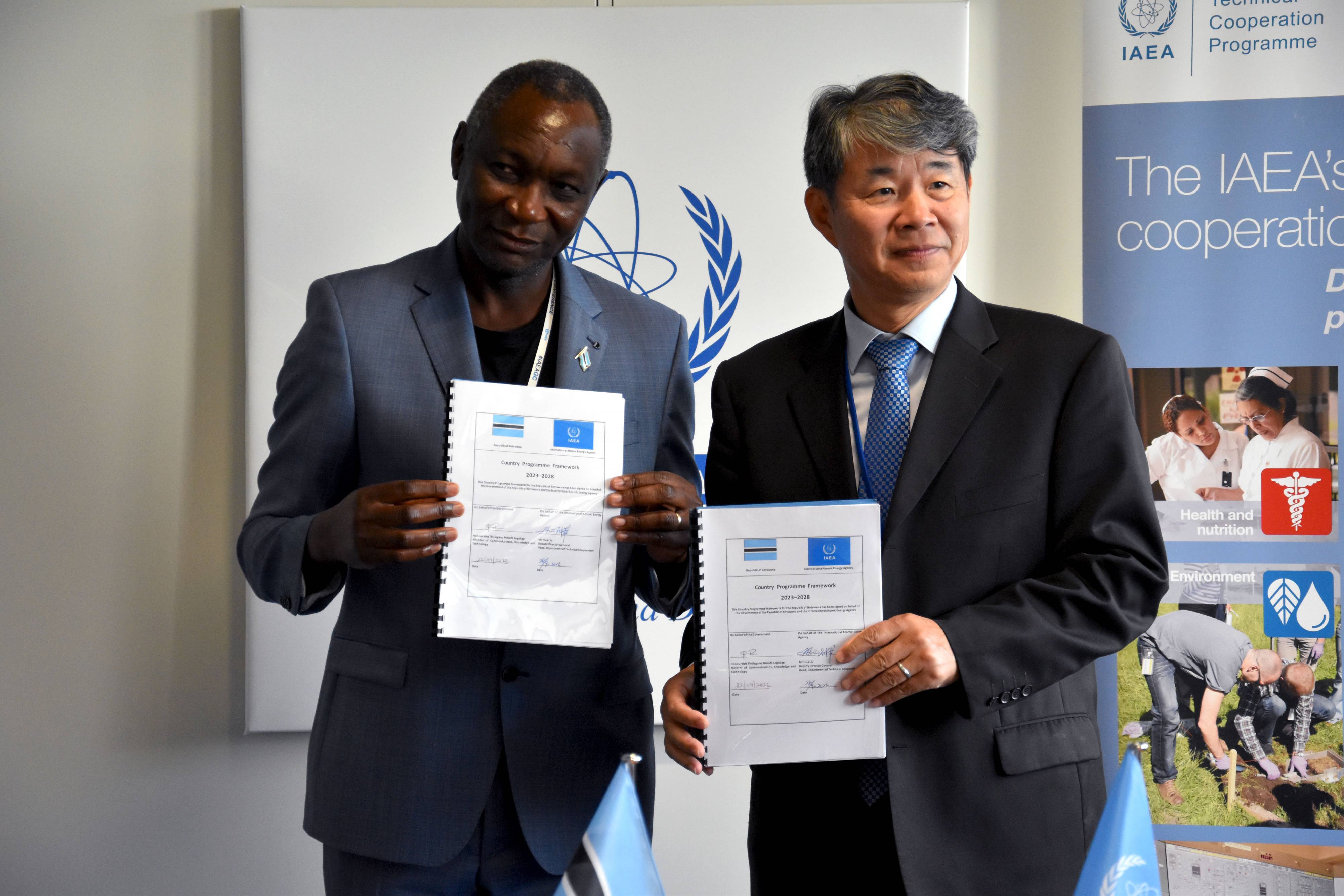 Thulagano Merafe Segokgo, Minister of Communications, Knowledge and Technology, and Hua Liu, IAEA Deputy Director General and Head of the Department of Technical Cooperation, signed Botswana's Country Programme Framework (CPF) for the period of 2023–2028 on 22 September, and 28 September 2022 respectively. A CPF is the frame of reference for the medium-term planning of technical cooperation between a Member State and the IAEA and identifies priority areas where the transfer of nuclear technology and technical cooperation resources will be directed to support national development goals.