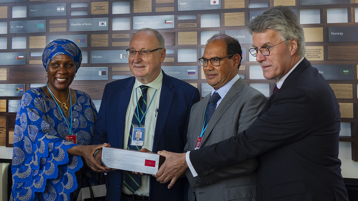 The flags of three countries, Brazil, Jordan and Morocco, were ceremonially added to the “donor wall” of the IAEA Nuclear Applications Laboratories today, highlighting their recent first-time financial contributions to the renovation of the laboratories. The wall honours the political commitment of 34 Member States and individuals that have contributed to the advancement of the Renovation of the Nuclear Applications Laboratories (ReNuAL) project.