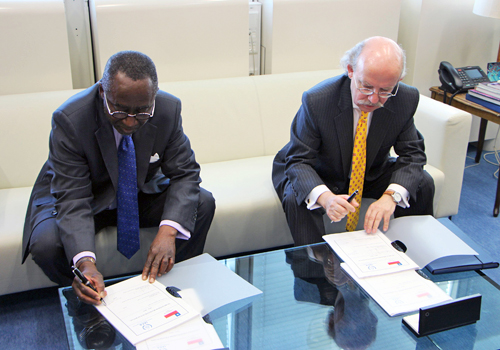 H.E. Ambassador Armin Andereya, Resident Representative to the IAEA and Kwaku Aning, IAEA Deputy Director General and Head of the Department of Technical Cooperation, have signed Chile's Country Programme Framework (CPF) for the period of 2014-2019 on 24 September 2014. A Country Programme Framework (CPF) is the frame of reference for the medium-term planning of technical cooperation between a Member State and the IAEA and identifies priority areas where the transfer of nuclear technology and technical cooperation resources will be directed to support national development goals.
