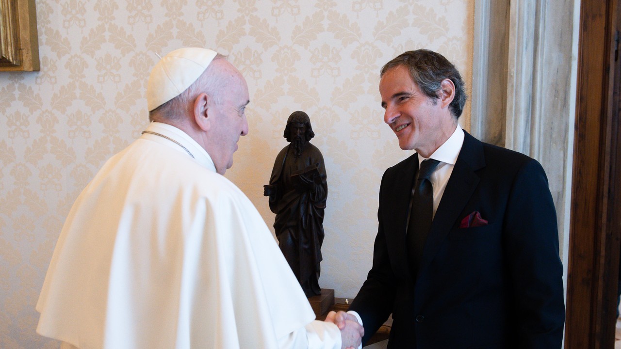 An instrument of peace, an accelerator of human health and development, a force of integral ecology, and a voice of harmony in troubled times. These were the words Director General Rafael Mariano Grossi used to describe the IAEA in a private audience with Pope Francis in Rome this morning. Meeting with the Pope, who is the head of state of the Holy See, an IAEA Member State, Mr Grossi highlighted peaceful uses of nuclear technology and the benefits they bring, and the two discussed nuclear non-proliferation’s role towards creating a safer and more peaceful world.