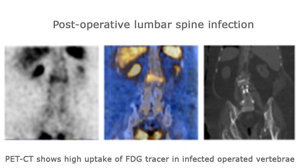 PET-CT illustrating the high interest of this imaging modality in the diagnosis of operative lumbar spine infection.