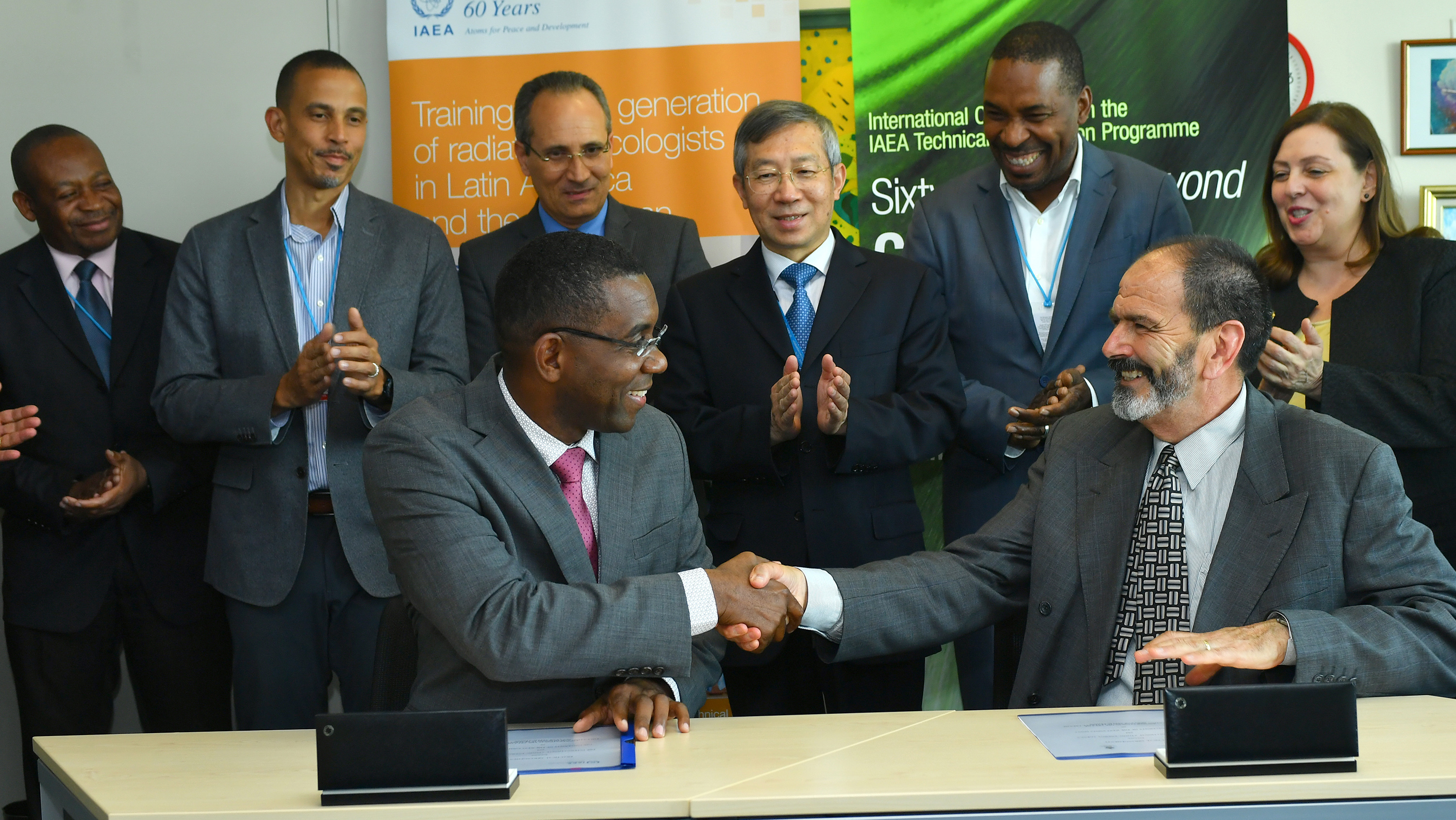A signing ceremony for the first Practical Arrangement between the University of the West Indies Mona and the IAEA was held at IAEA headquarters in Vienna on 31 May, in the presence of a delegation of Members of the Board of the University Hospital of West Indies (UHWI). The new agreement, signed by Professor McDonald Principal of UWI Mona on 24 May in Kingston, Jamaica, and by Luis Longoria, Director of the Division of Latin America and the Caribbean on 31 May, will underpin collaboration between the two organizations in the training of professionals in radiology, nuclear medicine, radiotherapy, medical radiation physics, the use of stable isotopes in nutrition, and radiation safety, among others. The agreement also supports collaboration for the creation of nuclear knowledge and information management programmes at the University of the West Indies.