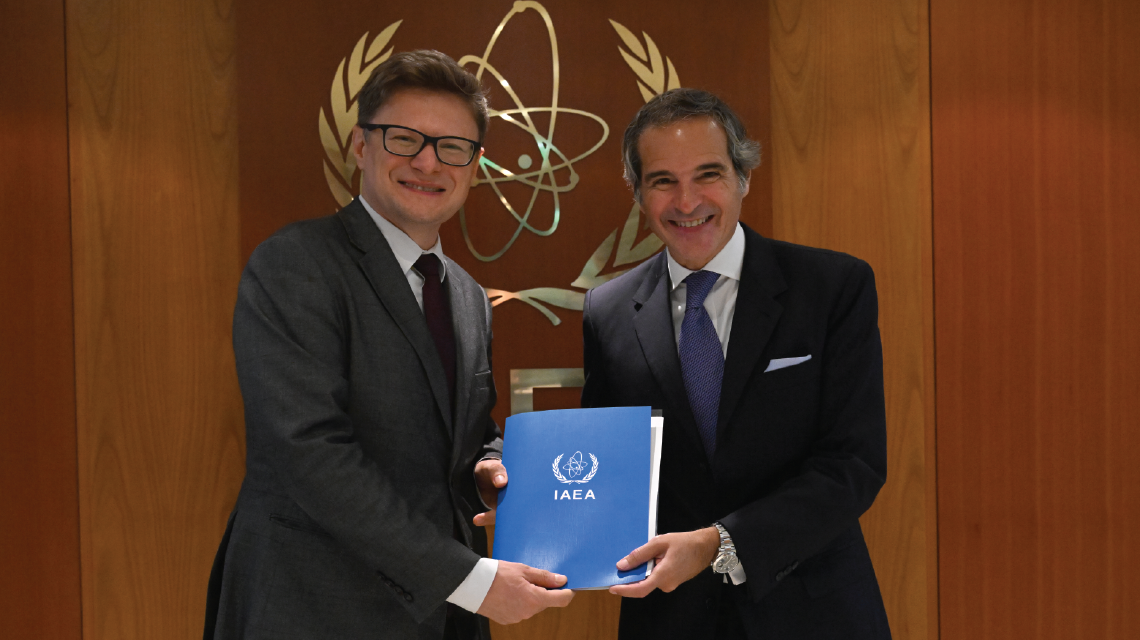 IAEA Director General Rafael Mariano Grossi handing the INIR Phase 2 mission report to&nbsp;Pawel Pytlarczyk, the Director of the Polish Ministry of Industry's Department of Nuclear Energy, on 16 September 2024. (Photo: D. Calma/IAEA)